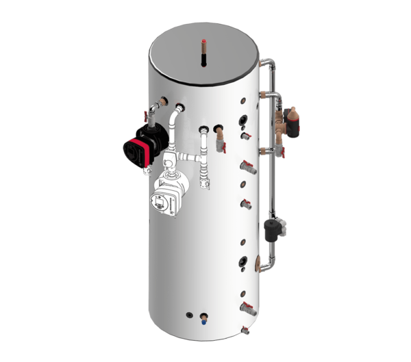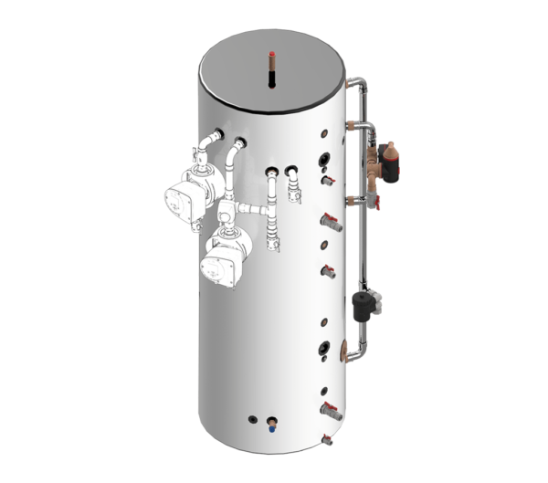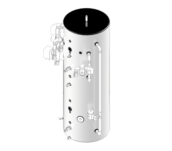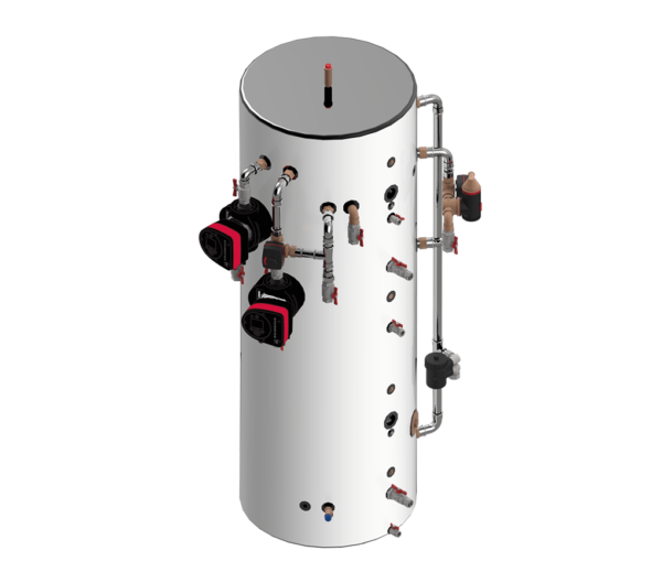 Die Haupteinheit des Wärmezentrums ist ein isolierter 95-Liter-Pufferspeicher aus Edelstahl, der speziell für Wärmepumpen-Heiz-/Kühlsysteme entwickelt wurde.